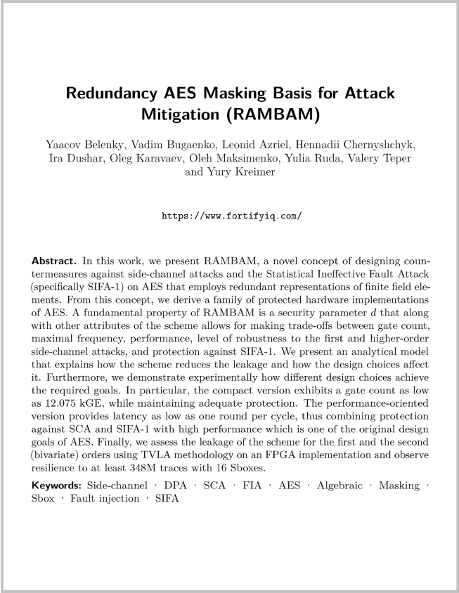 FortifyIQ presents RAMBAM - a novel concept of designing countermeasures against side-channel attacks and the Statistical Ineffective Fault Attack (specifically SIFA-1) on AES that employs redundant representations of finite field elements.